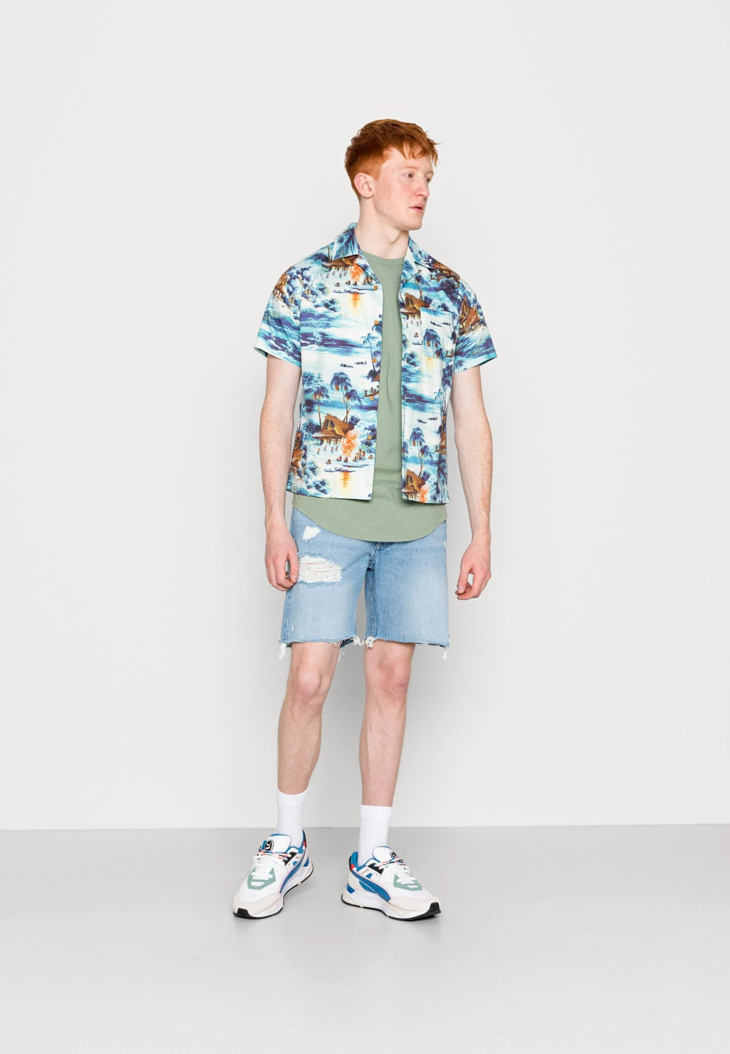 Tom Tailor Gemusterte Cargo – Shorts – Mint Navy Big Leaf Design